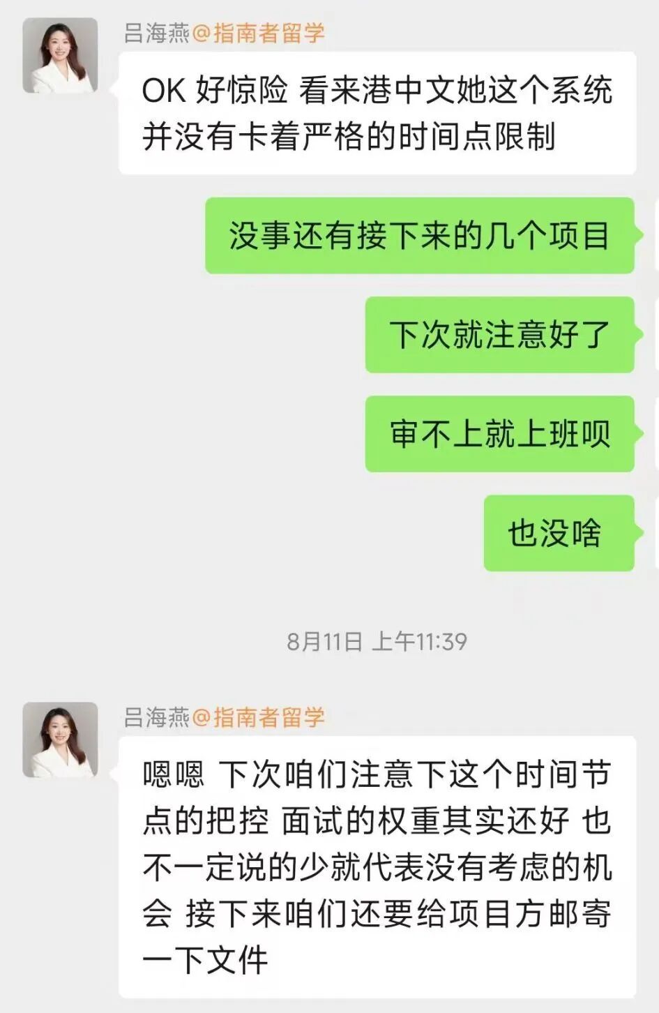 申请季开始后,我一边实习一边忙着投递项目,指南者留学结合我的背景,从人文到商科,按申请难度梯度为我设计了 6 个项目,并按时间进度依次投递。