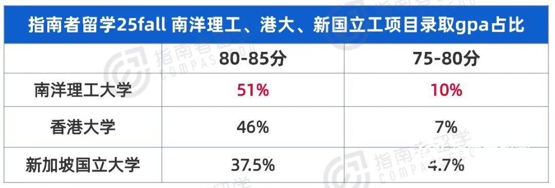 对比QS排名相近的港大、新国立可以发现,在工科项目的录取上,南洋理工对于均分的要求可以说是最宽松的,80-85分占比51%,甚至75-80分的同学占到了10%,包容度相当之大。