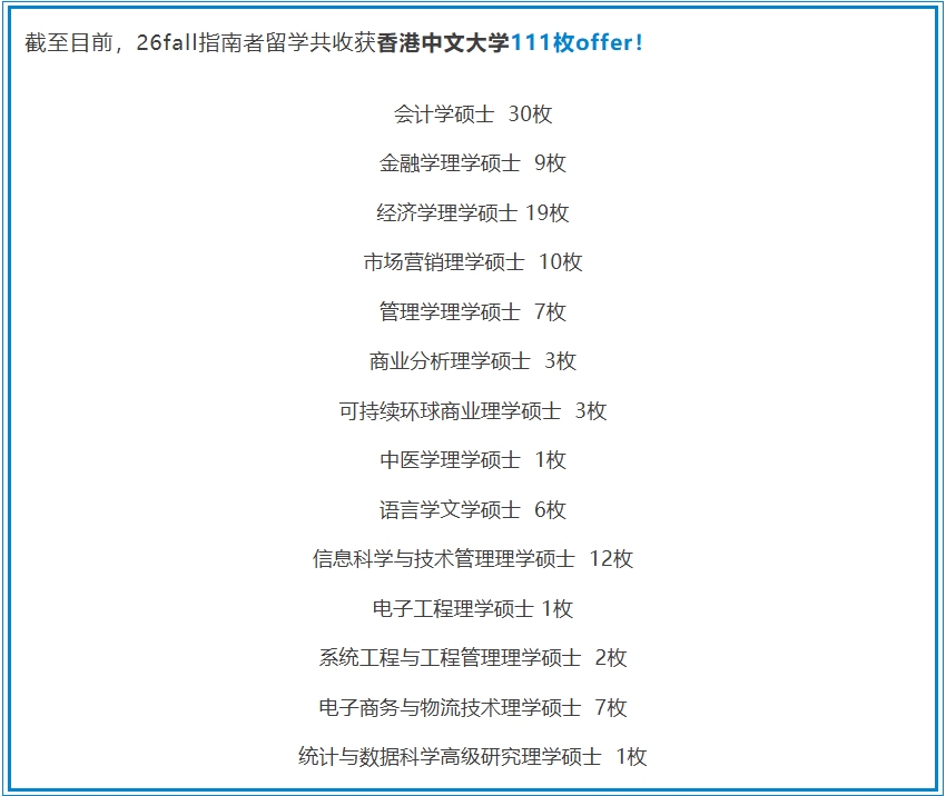 截至昨天(10.13)!指南者留学已经拿到了香港中文大学26fall共计111枚offer!