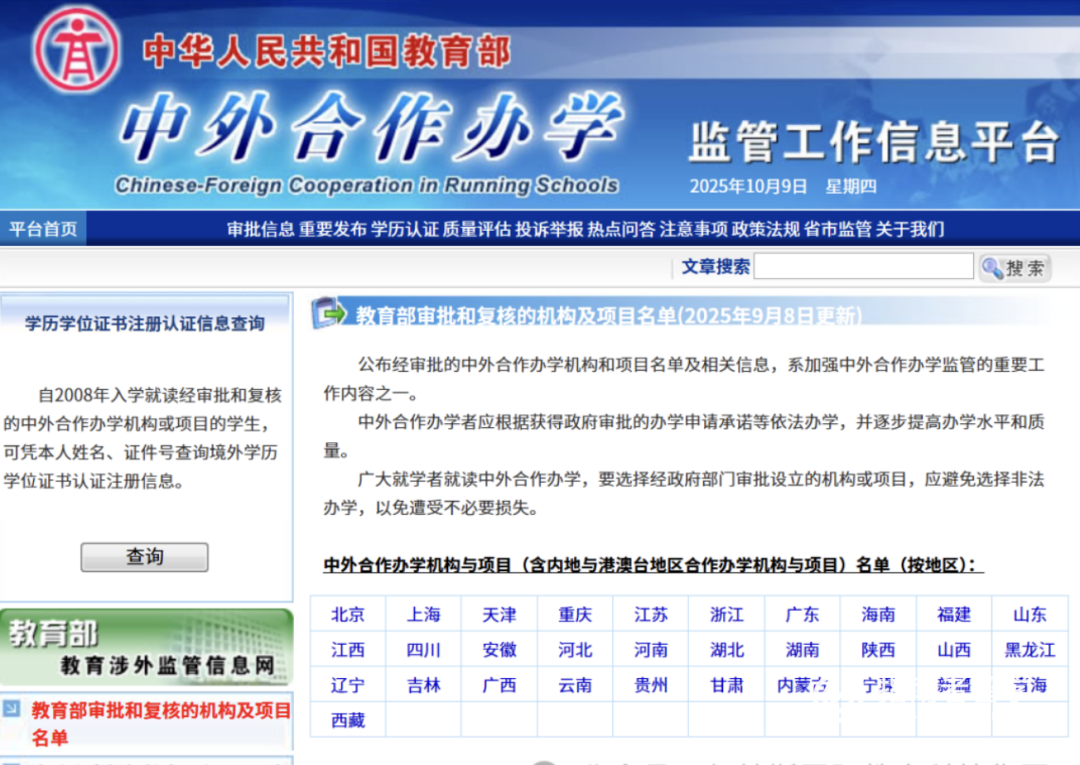 9月,教育部中外合作办学官网公布了2025年下半年中外合作办学的最新调整情况和新增项目名单。