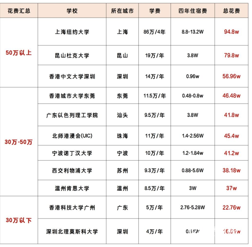 中外合作办学成本普遍高于普通院校,上海纽约大学前两年20万/年、后两年23万/年,港科广相对性价比高一些,也需要5万-10万/年,深圳北理莫斯科4万/年为最低。