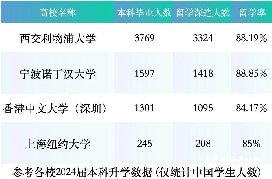 像是西交利物浦、宁波诺丁汉、港中深、上纽大、北师港浸大这五所中外合办的留学率平均在80%左右,只有一成左右的同学会选择就业和国内考研。