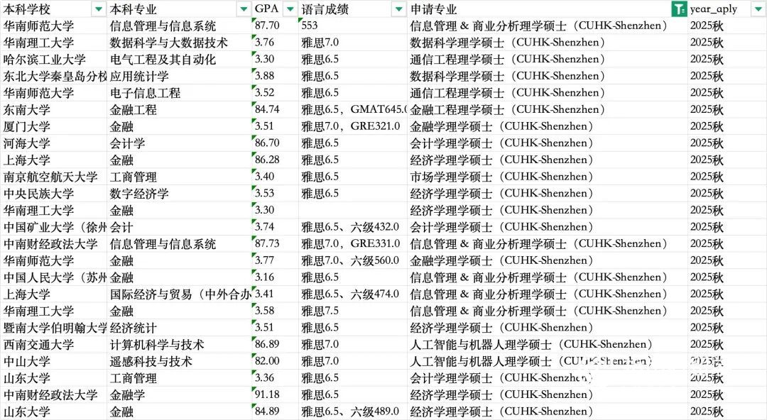 从指南者2025fall港中深的录取情况来看,录取的学生主要来自985、211院校,也有部分优质双非院校的学生。