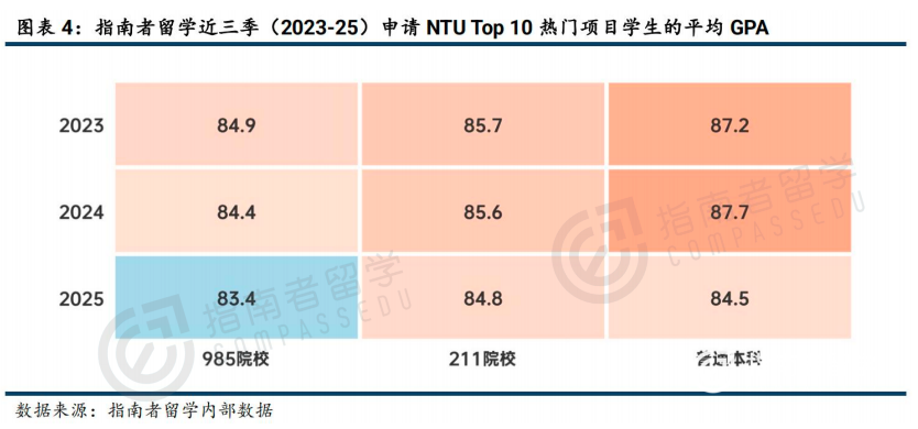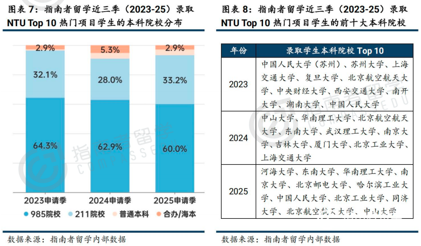 NTU Top10项目申请者同样以985/211为主,近三年合计占比超八成,2025年985学生占比54.0%。