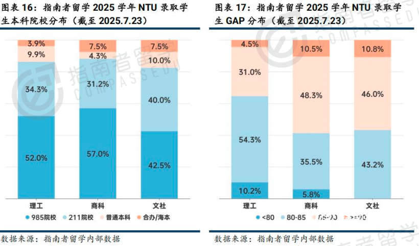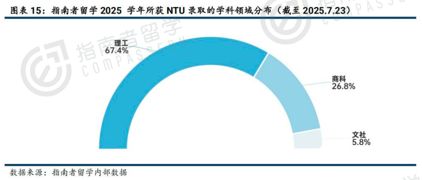 25Fall获得的录取中,理工科录取占比67.4%,与 NTU开设大量理工科项目直接相关;商科占 26.8%,文社科仅5.8%。