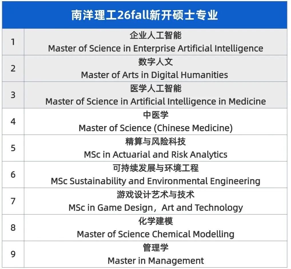 26fall刚开始,南洋理工一口气推出9大新专业,3个是AI方向!涵盖商科、人工智能、人文、医学等领域。