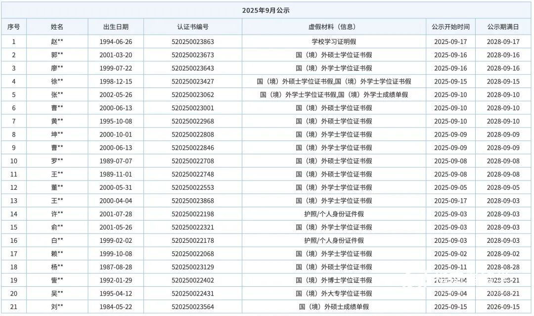 事实上,留服认证每个月都会公示学历造假名单,失信名单已经公示了几年,月月也都有名单更新,涉及学士、硕士、博士学位证书造假、成绩单造假等等。
