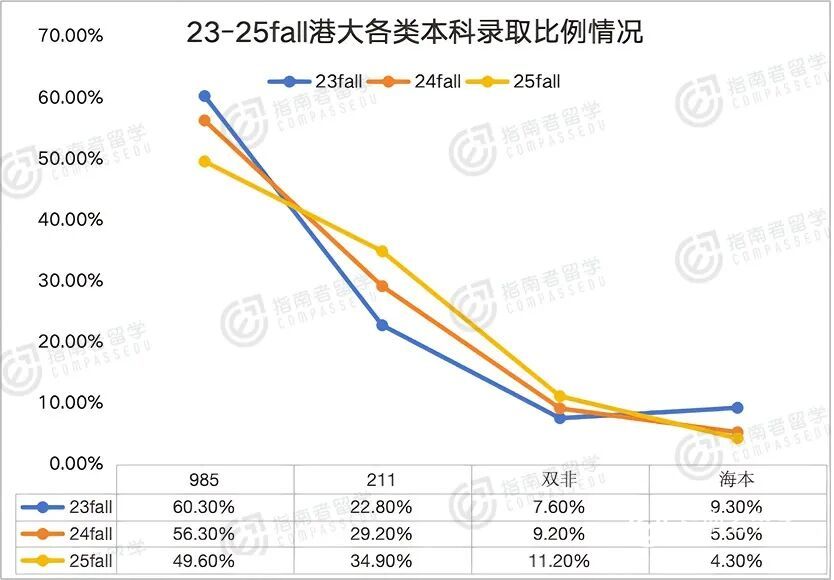 2023至2025fall期间,港大录取生源呈现出海本录取比例持续下滑、985占比收缩但211与双非院校群体显著上涨的鲜明趋势。