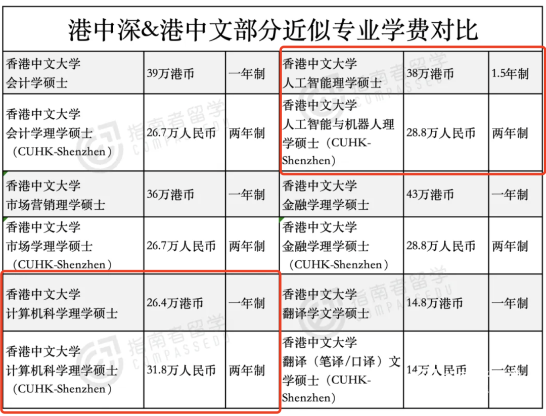 就拿热门的人工智能项目来说,在港中文本部需要读一年半,学费要38万港币;但在港中深读两年,学费才28.8万人民币,单学费就快省了10万。