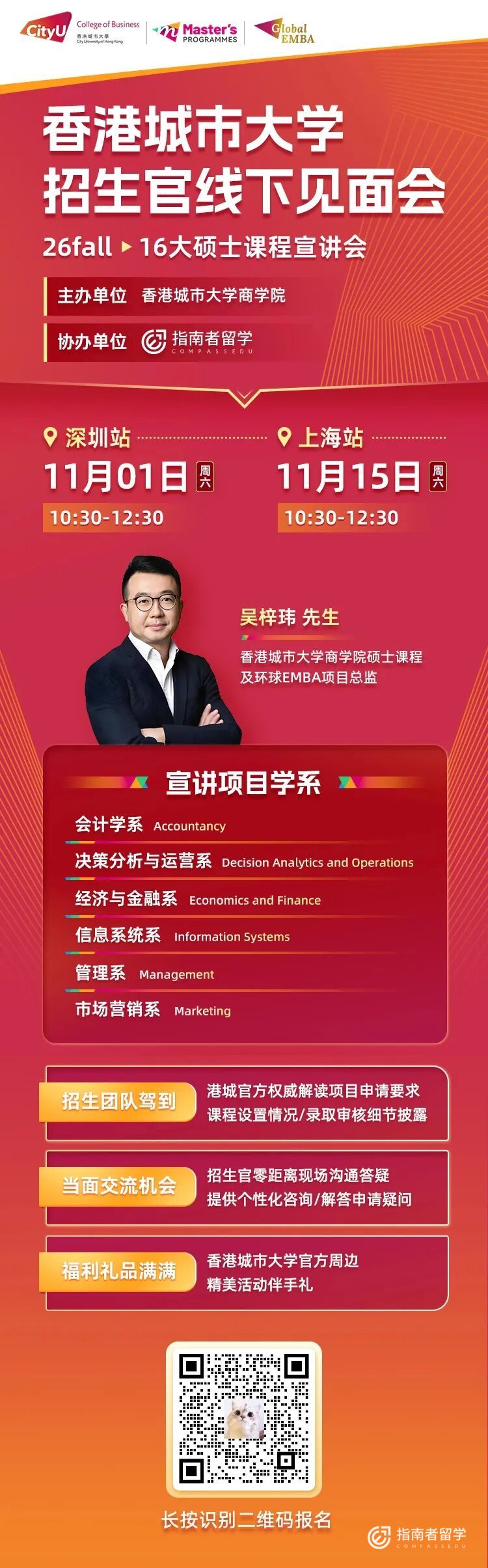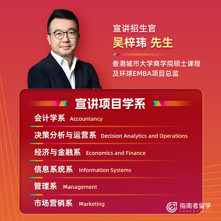 活动当天,将由香港城市大学商学院硕士课程及环球EMBA项目总监吴梓玮先生,带来港城商学院16大项目申请的权威解读,包括课程设置情况、录取审核细节等等。