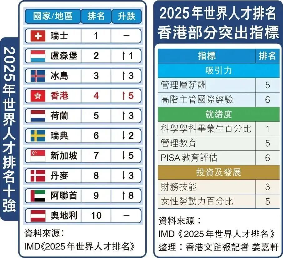 前不久,2025年世界人才排名正式出炉,中国香港跃至全球第四,亚洲第一!