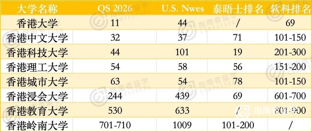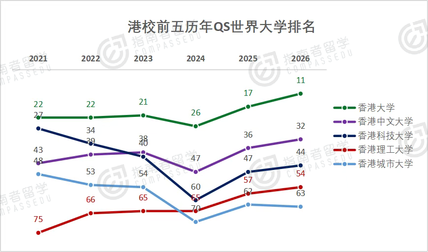 从2021至2026年,港校在QS排名中也保持强劲势头:香港大学持续领跑,2026年高居全球第11位。港中文、港科大、港理工、港城大均稳居全球前70。