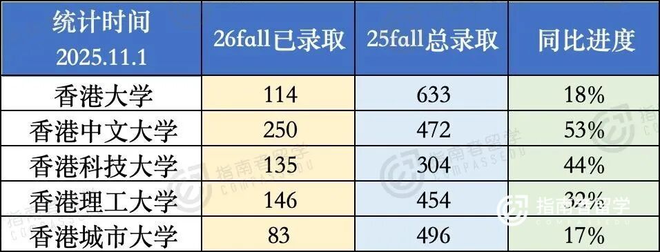 具体到各校看,香港中文大学的录取进度最为迅猛,26fall指南者留学已拿到250枚港中文offer,对比25fall总录取472人,同比进度达到53%,可见26fall招生进程中节奏之快。