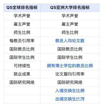 根本原因是排名考核维度不同,简单说,QS世界排名更看重“全球竞争力”,QS亚洲排名更看中“亚洲区域影响力”。而且亚洲排名中的部分指标,如出入境交换生比例等,确实会对结果有所影响。