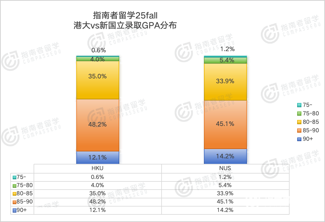 然而,在绩点方面,港大却比新国立要严格了许多,从绩点分层上看不算非常明显,但港大的申请量远超新国立的,如果从申请数量上看会非常明显。