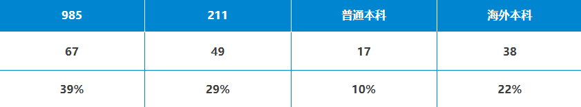 其中,本科院校背景来自985院校的同学共计67枚;211院校的同学共计49枚;普通本科共计17枚;海外本科38枚。