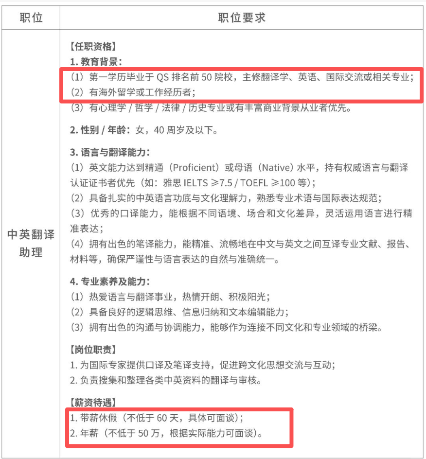 这待遇无论放在哪个行业,都是妥妥的“福利天花板”!但更让人直呼“离谱”的是配套要求:第一学历必须是QS排名前50院校,且须具备海外留学或工作经历。