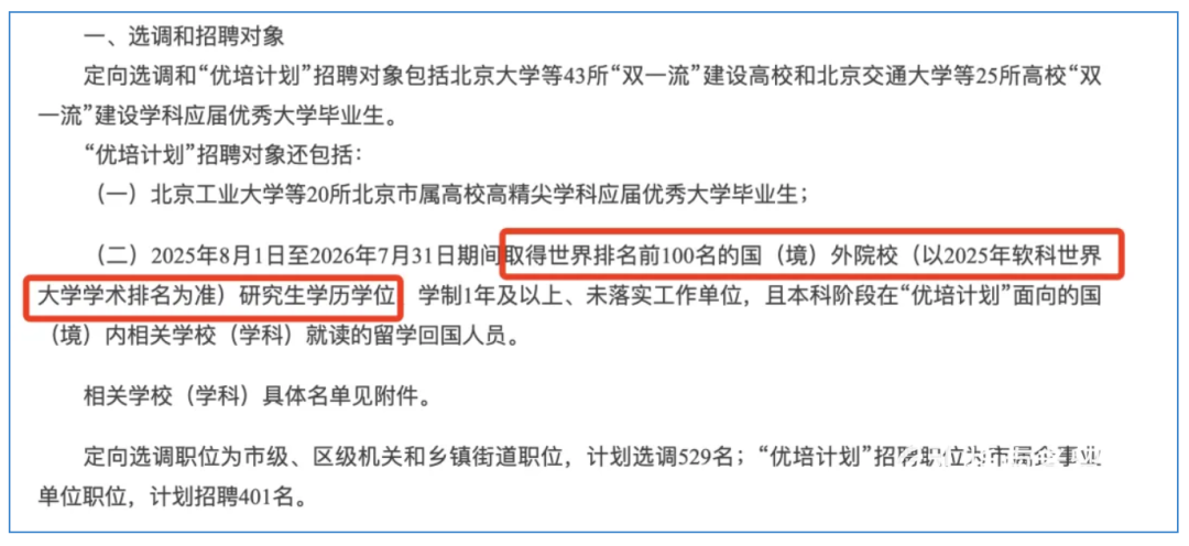 此前,与北京选调同宣的“优培计划”中提到了留学生的报名要求是,25软科世界排名top100院校的毕业生可报名~