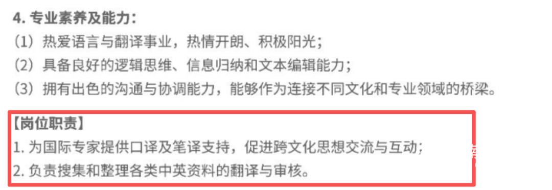 更关键的是,这是一份纯文科岗位,岗位职责是为国际专家提供口译笔译的支持,促进跨文化的思想交流和互动,以及搜集整理中英资料的翻译审核等等工作。