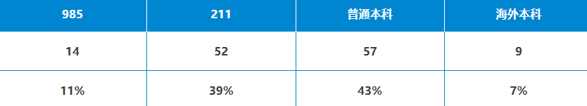 其中,本科院校背景来自985院校的同学共计14枚;211院校的同学共计52枚;普通本科共计57枚;海外本科9枚。