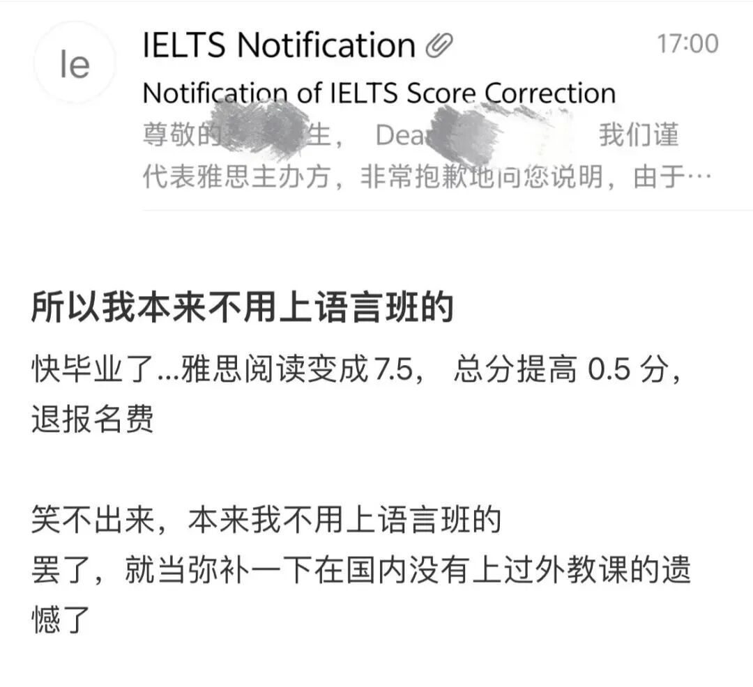更离谱的是,这个错误直到2025年11月才被发现,整整两年时间,有同学开玩笑说“带着考错的分数都读完一年硕了,雅思才带来了迟到的道歉”。