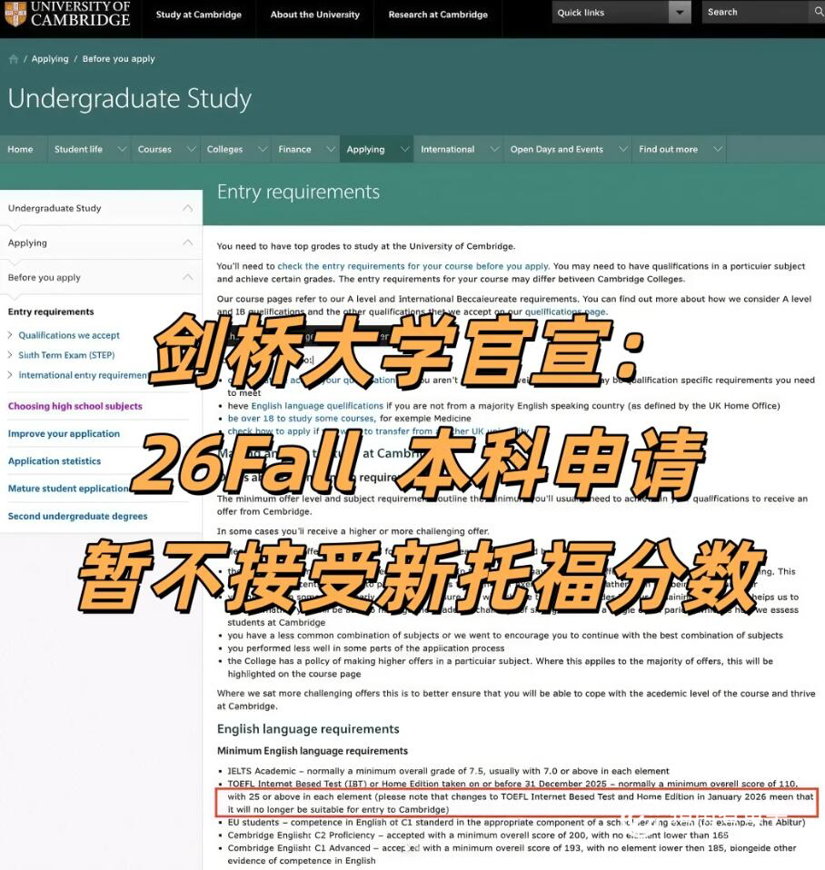 前不久,英国顶尖名校:牛津和剑桥纷纷突然扔出重磅消息:2026年1月20日起,不再接受任何形式的托福成绩,仅认可雅思、剑桥英语等考试!