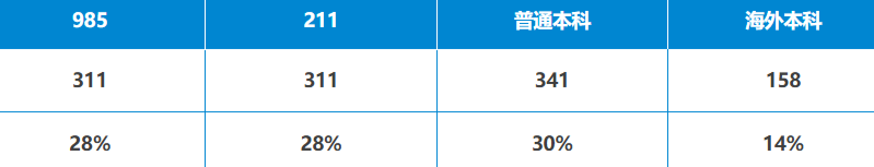 从学生院校背景来看,来自985院校的同学共计311枚;211院校的同学共计311枚;普通本科共计341枚;海外本科158枚。