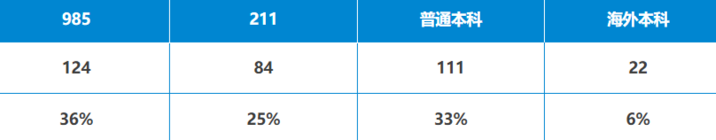 从学生院校背景来看,来自985院校的同学共计124枚;211院校的同学共计84枚;普通本科共计111枚;海外本科22枚。