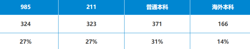 从学生院校背景来看,来自985院校的同学共计324枚;211院校的同学共计323枚;普通本科共计371枚;海外本科166枚。