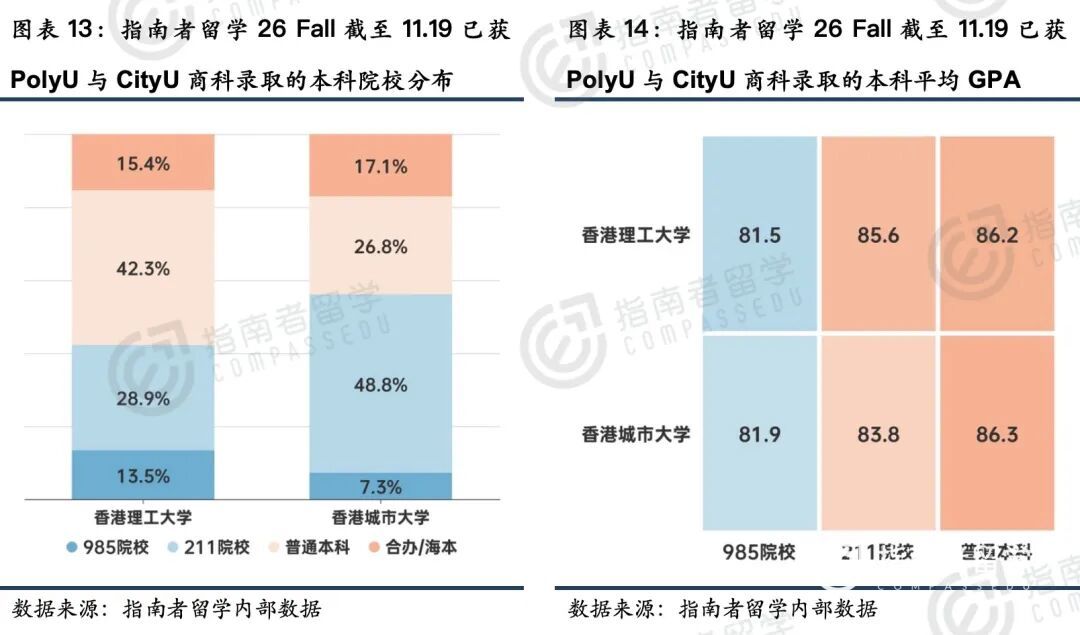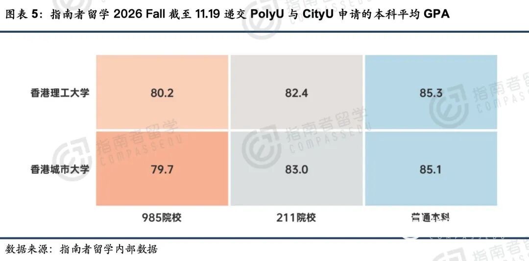 对大部分应届申请的同学来说,港城大更友好:985占比相对较低,985/211的平均GPA也更低~