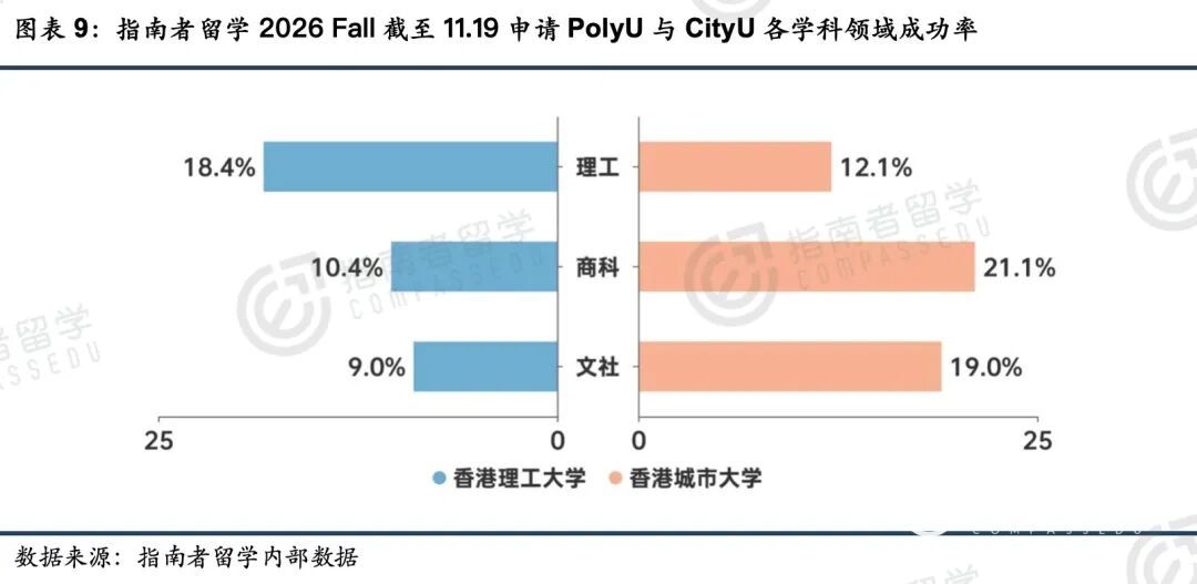 但商科和文社科的情况直接反转!港城大虽说申请开放得比港理工晚,但成功率直接飙到20%左右,是港理工(约10%)的两倍!