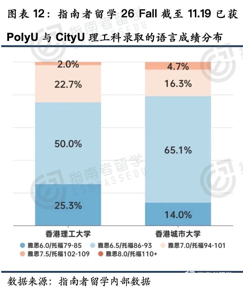 语言成绩方面,两校大多数理工科专业的要求都是雅思6.0,但实际录取中,港理工和港城大的平均雅思成绩为6.5和6.6。