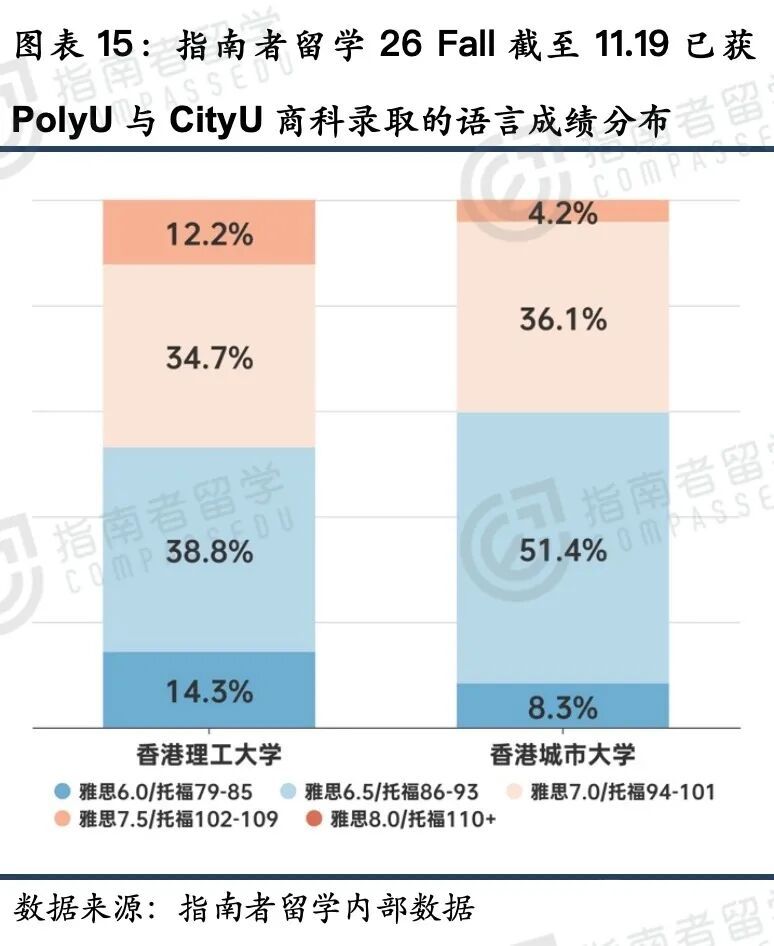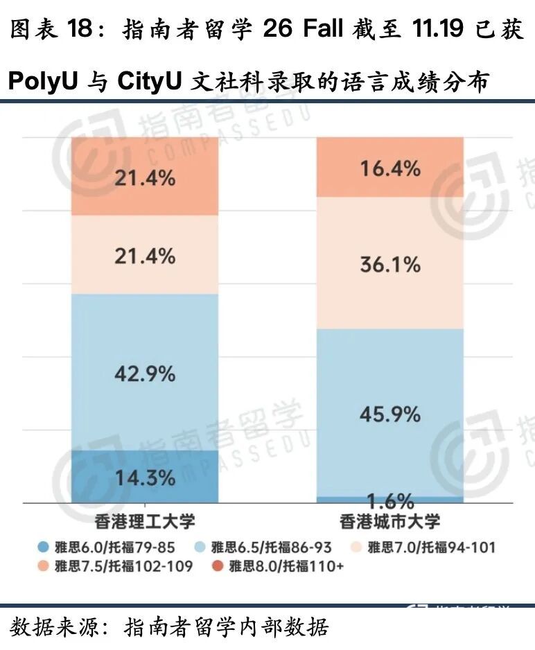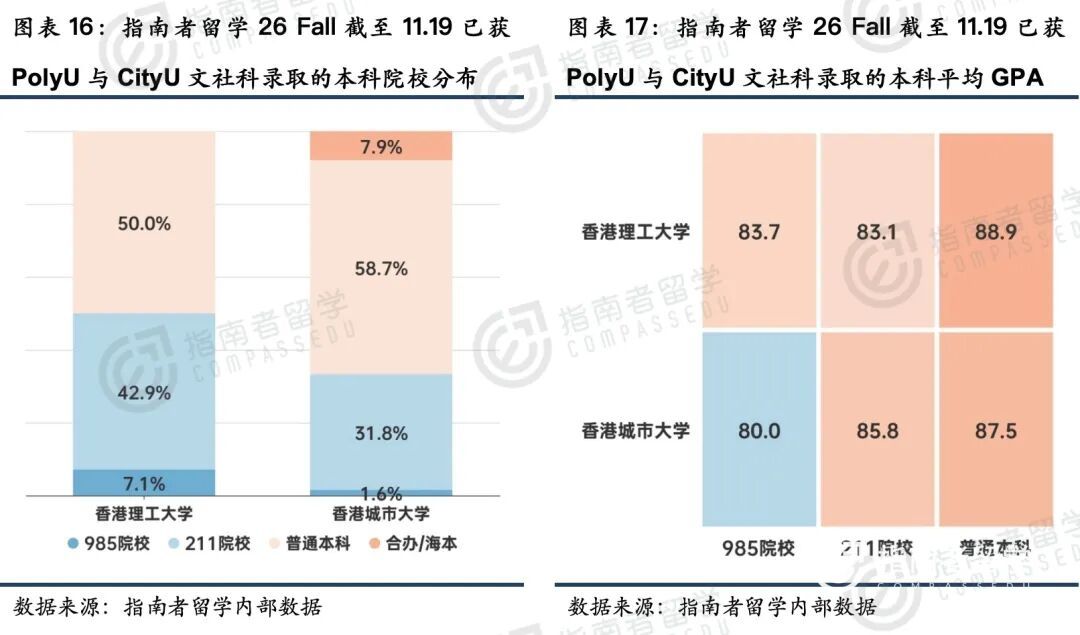 从截止11.19我们所获的两校文社科录取可以看到,港理工录取中985/211占50%,港城大只有33%,双非同学选港城大机会更多,GPA要求也是港理工略高~