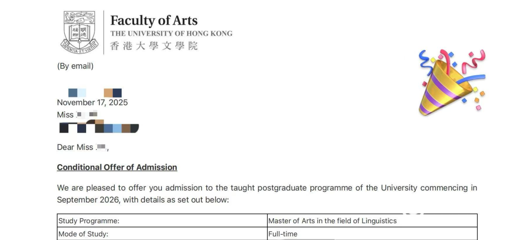 10月24日港大面试结束后,仅过6天就收到了推研通知;10月30日,港中文语言学推研也如期而至;11月3日,港中文翻译推研offer也顺利到手。