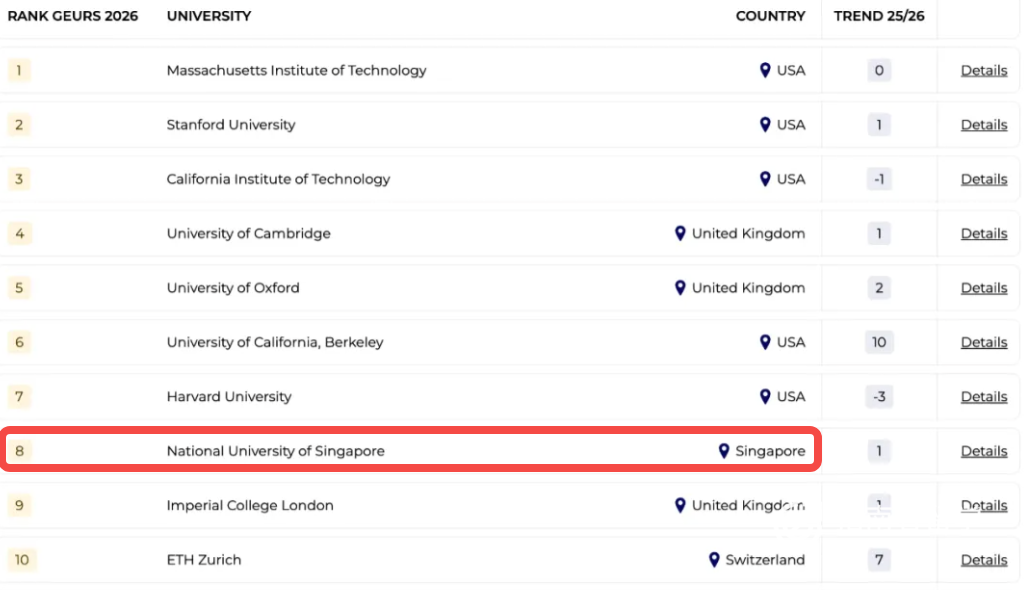 在榜单的Top 10里,欧美名校还是老样子“霸屏”:美国5席,英国3席,剩下的两席留给了新加坡国立大学和苏黎世联邦理工学院。能在哈佛、斯坦福这些“大佬”中间抢到第八名,新国立的就业含金量真不用多说。