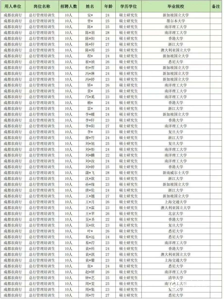 在成都农商银行同期的64人资格审查名单里,新国立7人,和NTU12人、港大11人一起,成为海外院校中的主力军。