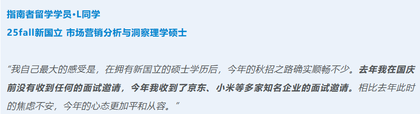除了这些公示的名单,指南者今年入学新国立的学姐也表示:在拿到NUS的学历后,再投递秋招感觉明显顺多了。