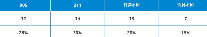 其中,本科院校背景来自985院校的同学共计12枚;211院校的同学共计14枚;普通本科共计13枚;海外本科7枚。