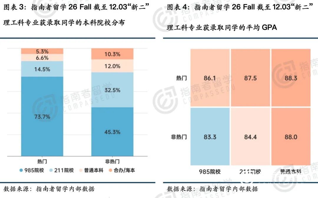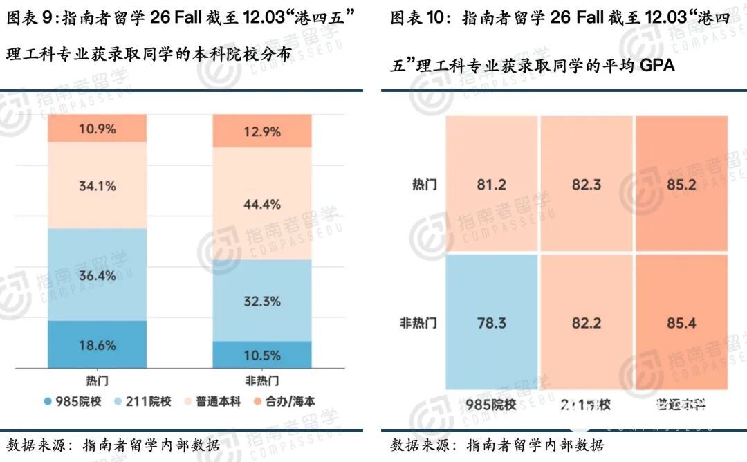 港前三理工科录取节奏快于新二所,实际录取中,热门专业与非热门专业之间同样呈现出显著差异:热门专业的录取生源中985院校毕业生占比更高、双非学生比例更低,平均GPA也普遍更高。