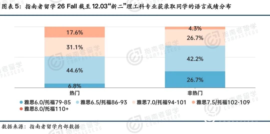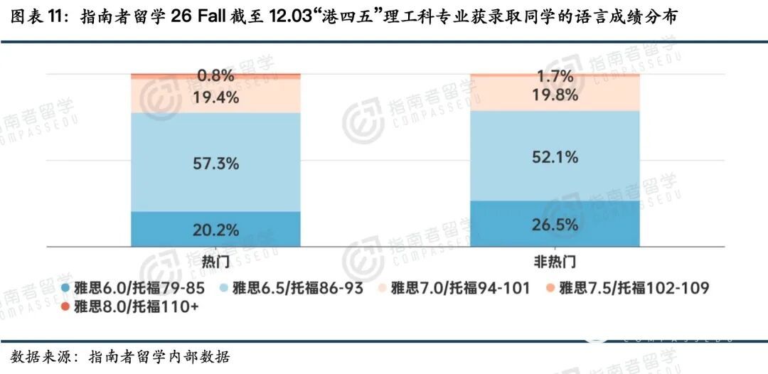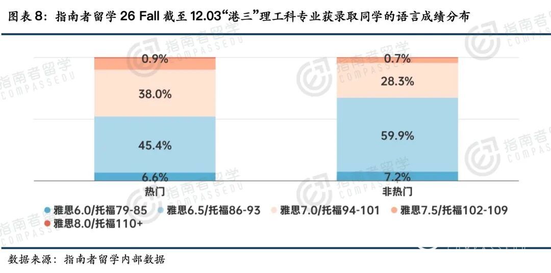 因为港中文和港科大最低要求雅思6.5,所以港三录取者的平均雅思成绩6.5及以上分数段的占比都略高于新二所。热门专业平均6.8分,非热门6.7分,整体差距不大。