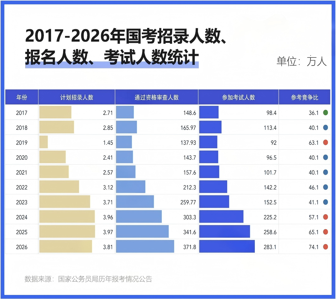 根据最新的信息,2026国考录取率仅为1.35%,约在74人中录取1人,整体难度更是创下10年来最低,相比22年的1:46报录比,难度快要翻倍!