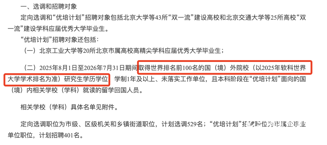 例如今年上海和北京的选调生公告,确实取消了面向境外高校的招录范围。但这并非大家想象中的一刀切,至少在北京优培计划中还是面向软科100以内的境外高校。