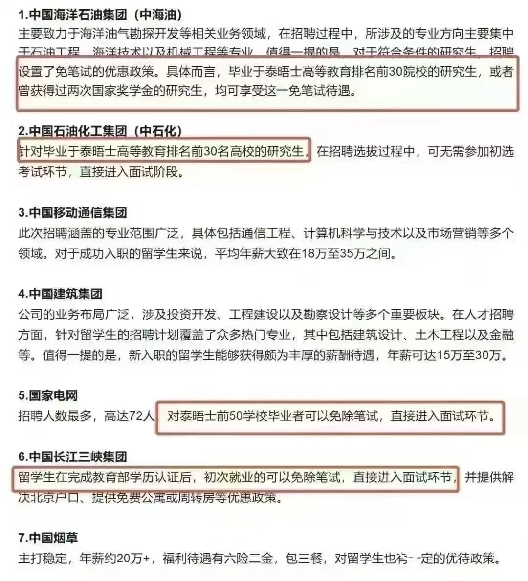 2025年,军事科学院首次将QS前200高校毕业生纳入军官招聘的范围,还有一些知名国企,如中石油、国家电网、三峡集团等都明确指出对世界排名前50或前30的留学生免笔试。