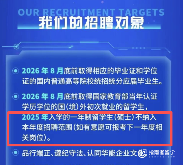 就拿国内能源领域的核心央企华能来说吧,2025年校招倒是还招留学生,但直接把2025年入学的一年制硕士划了出去,公告里写着“不纳入本年度招聘范围,如有意愿可报考下一年度相关岗位”。
