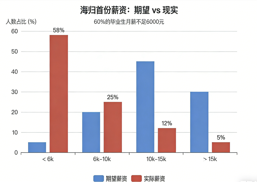 此前有媒体调查,大部分海归对首份工作的心理预期是月薪1.2万-2万,结果现实直接给了一记耳光。60%的海归实际月薪不足8000元,大量海归的起薪已经和国内双非一本毕业生持平,更有人吐槽“花百万留了个学,回国月薪才五千”。