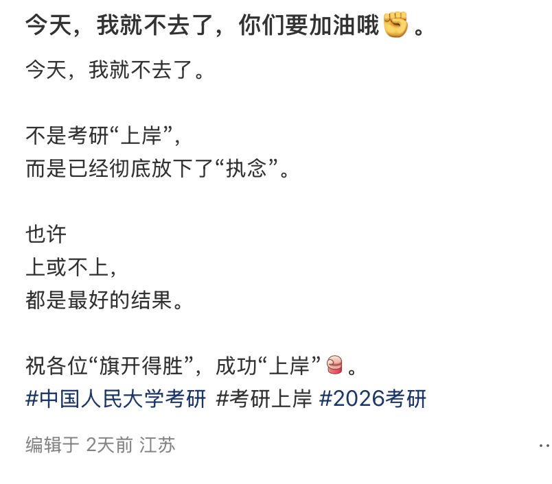 这两天刷到考研考场外的“逃兵文学”,有人在朋友圈自嘲“二十多天没背的知识点已经连夜跑路”,也有人发着“放下执念”的文案给战友加油……