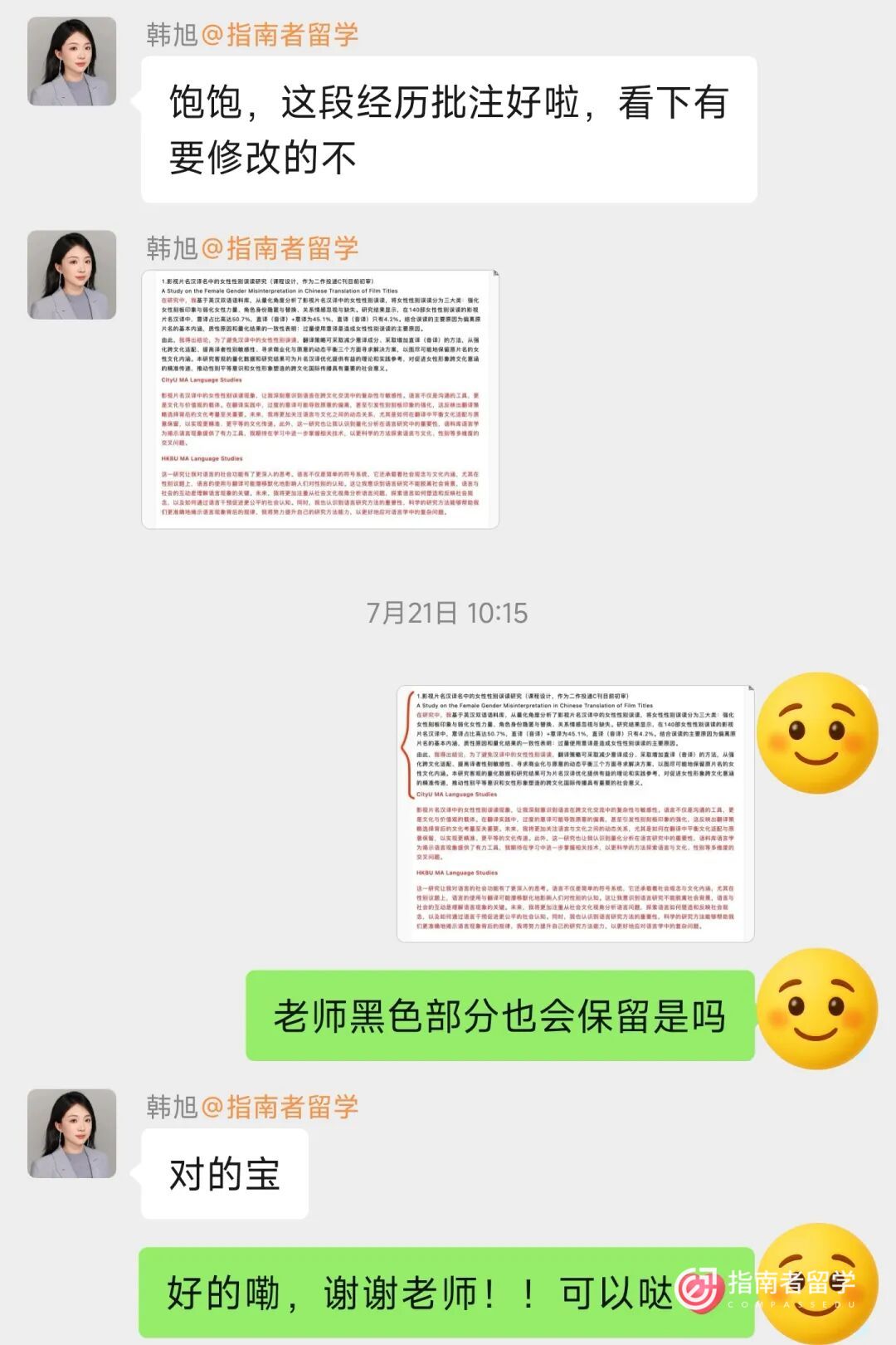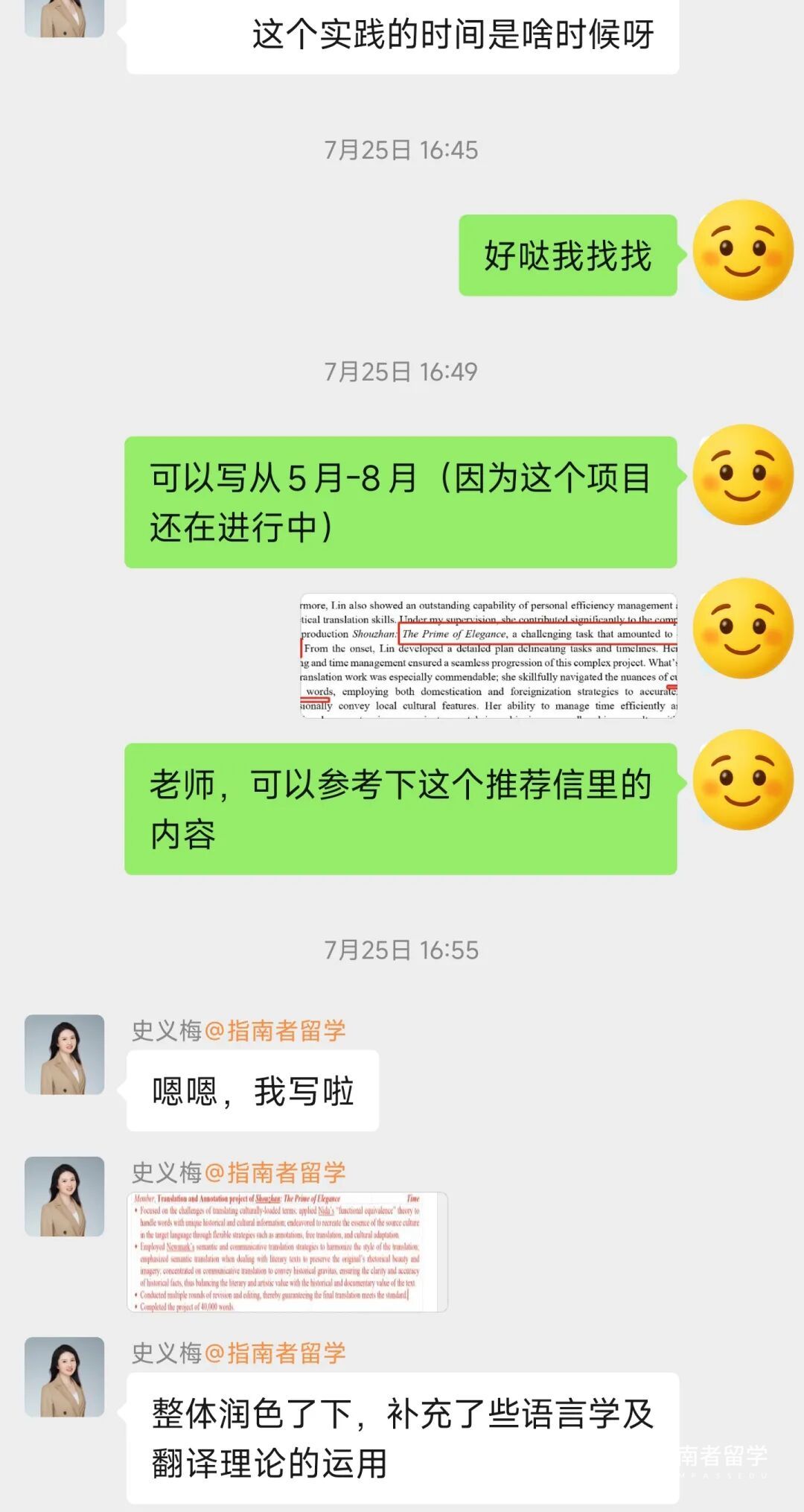 后来我想更新一段核心经历,联系韩老师后,她也立刻放下手头的工作和我沟通细节,和文书老师一起准备,帮我上传到学校官网,效率超高!