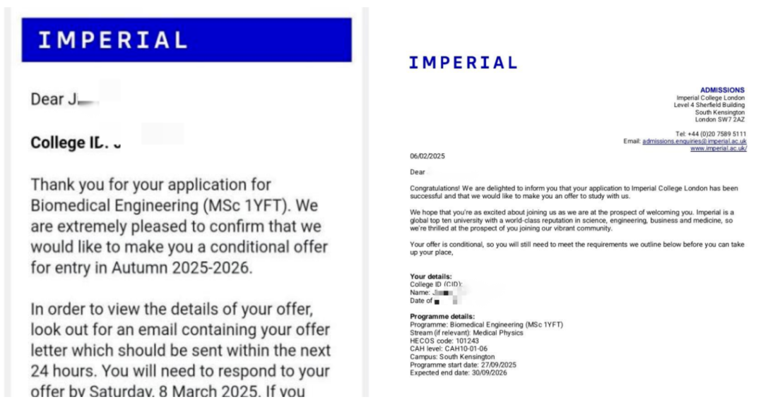 最终我惊喜收获了6个offer,包括IC、UCL、KCL、约翰霍普金斯、杜克、港中文,可以说是大满贯!大家只要好好准备,真的有逆袭的可能!