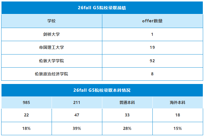 截至目前,在最新的26fall申请中,指南者留学共计收获120枚来自G5院校的offer。其中,剑桥大学1枚;帝国理工学院19枚;伦敦大学学院92枚;伦敦政治经济学院8枚。