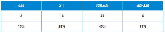 其中,本科院校背景来自985院校的同学共计8枚;211院校的同学共计16枚;普通本科共计25枚;海外本科6枚。